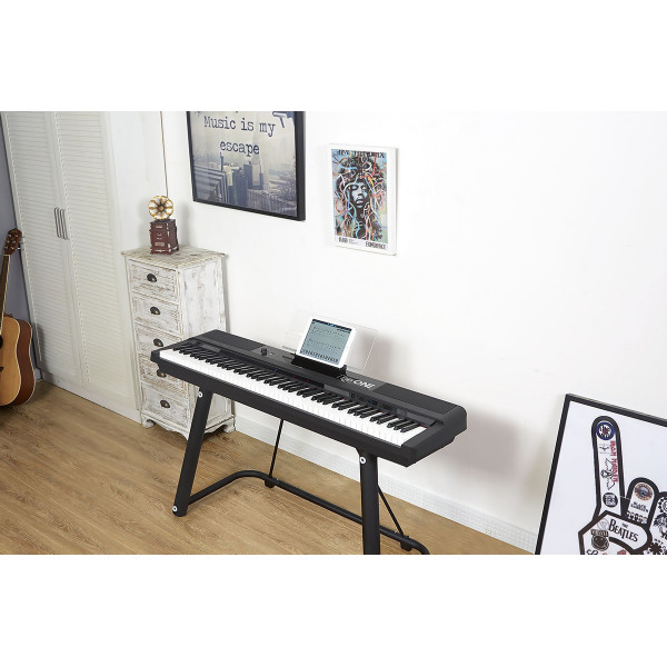 The ONE TON1 – це портативне 88-клавішне піаніно, яке може навчити Вас грати. Воно призначене як для початківців, так і досвідчених гравців. За допомогою спеціальних кабелів можна підключити піаніно до смарт-пристроїв Android або Apple. За допомогою програми The ONE Smart Piano можна розширити функції піаніно. Завдяки вбудованим 88 різнобарвним світлодіодним лампочкам, 4000+ нотам, 100 навчальним відео та веселим іграм у безкоштовному додатку, це піаніно дозволить Вам почати грати за лічені хвилини. The ONE TON1 – це більше, ніж просто піаніно, але це також вчитель гри на фортепіано. Світлодіодні індикатори працюють із безкоштовним додатком та світяться, показуючи Вам, які клавіші потрібно натиснути. Вогники світитимуться доти, доки Ви не натиснете потрібні ноти. Підключіть навушники, щоб насолоджуватися безшумною практикою.