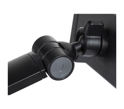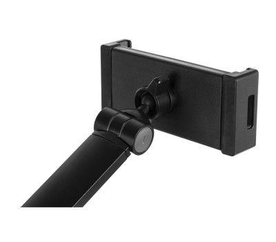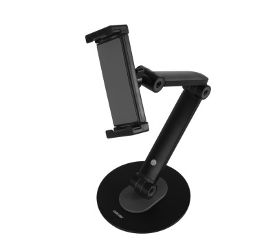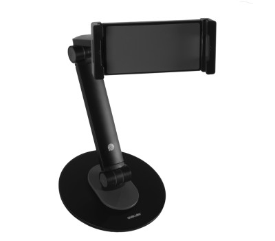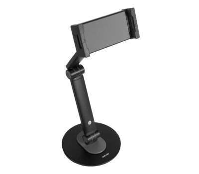 Висока стійкість гарантується великою круглою основою діаметром 16 см і вагою 1.1 кг. У нижній частині основи застосована накладка з м'якого матеріалу, що сприяє зчепленню з опорною поверхнею та запобігає ризику появи подряпин. Два важелі, що регулюються, дозволяють вам досягти максимальної висоти 47 см, а з'єднання в основі смартфона за допомогою шарнірного гвинтового механізму забезпечує зручне регулювання кута. Тримач підходить для пристроїв з мінімальною висотою 12.8 см та максимальною 22.4 см завдяки зручному вбудованому пружинному механізму.