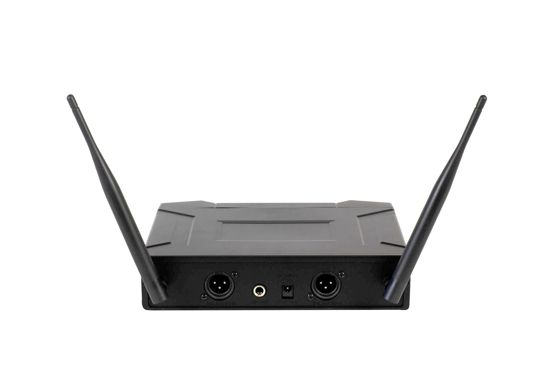 Професійна радіосистема UHF: два ручних динамічних радіомікрофона - 650.9MHz та 675.5MHz, живлення від 2-х батарейок АА, 1/2 U приймач (база) - роздільне регулювання гучності каналів, роздільні симетричні XLR виходи, загальний MIXOUT вихід (JACK 6.3мм) , в комплекті кабель JACK-JACK 6.3мм 1м, і пластиковий кейс з ущільнювачем.