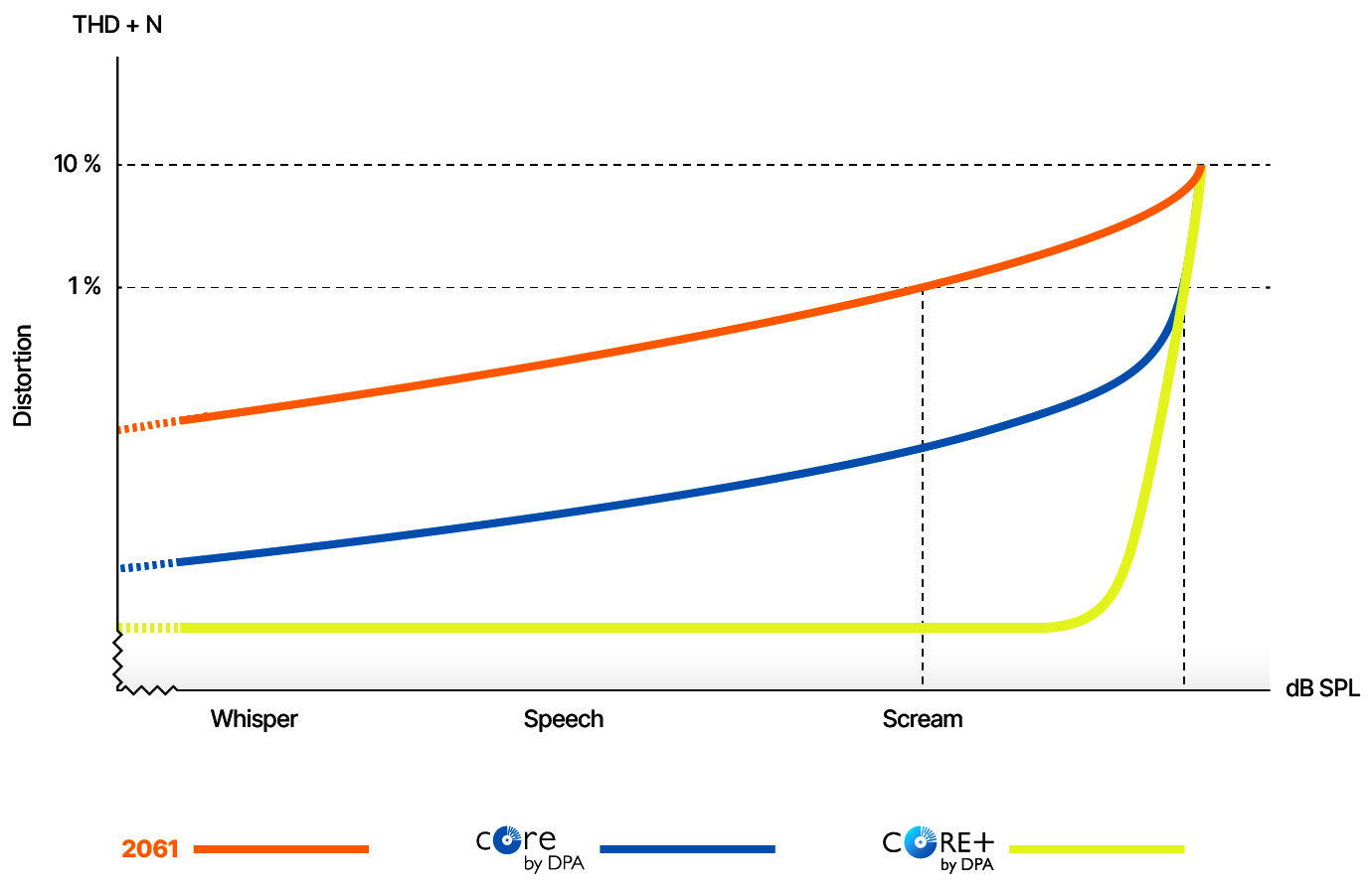 CORE від DPA це потужна нова технологія в основі наших мініатюрних мікрофонів. Ми мінімізували спотворення. Від шепоту до крику ви відчуєте підвищену чіткість та відкритість звуку. Тепер ми взяли приголомшливу технологію CORE та зменшили її, щоб вона помістилася у субмініатюрні мікрофони розміром 3 мм (0.12 дюйми). Це означає, що, незважаючи на їх маленький розмір, продуктивність серії 6060 CORE повністю можна порівняти з мініатюрними капсулями 5 мм (0.20 дюйма), які люблять по всьому світу. Ці субмініатюрні мікрофони мають нижчий рівень шуму, ніж будь-який інший капсуль 3 мм (0.12 дюйми) на ринку, і краще справляються з високим рівнем звукового тиску без спотворень. З точки зору технічних характеристик модель 6061 має рівень шуму всього 26 дБ(A), що відповідає капсулям DPA 5 мм (0.20 дюйма).