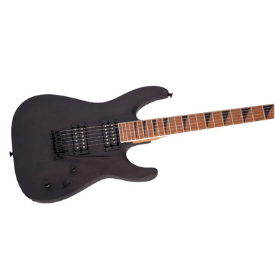 Електрогітара Jackson JS24 DKAM Dinky Arch Top Black Satin представлена в чорному кольорі з чорною головою грифа і фурнітурою.