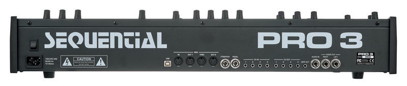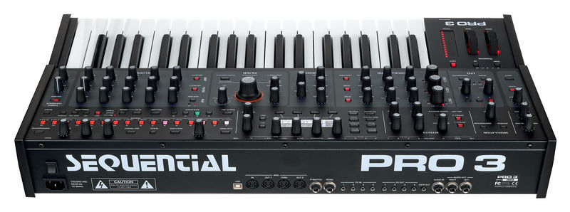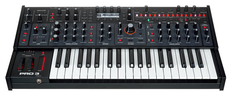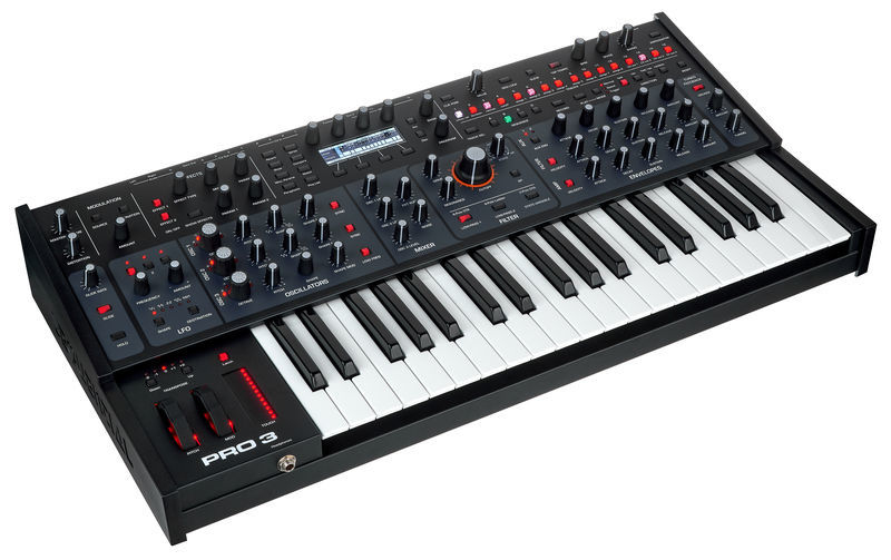 Pro 3 - аналоговий синтезатор з трьома осциляторами, 2 з яких аналогові і 1 цифровий. Аналогові осцилятори виробляють 3 класичні форми: трикутник, пилу і імпульс, цифровий - 32 табличнохвильові форми з 16 хвилями кожна, плюс класичні форми: синусоїда, трикутник, пила, імпульс. 3 класичних фільтра, 3 LFO, 4 ADSR огинаючі. Цифрові ефекти: Stereo delay, BBD delay, chorus, flanger, phaser, ring mod, vintage rotating speaker, distortion, high-pass filter, super plate reverb. 16-трековий сиквенсор, арпеджиатор, 512 призначених для користувача і 512 заводських програм. 3-октавна напівзважена клавіатура Fatar. Розміри: 67.7 x 33.8 x 12.5 см. Вага: 7.25 Кг.