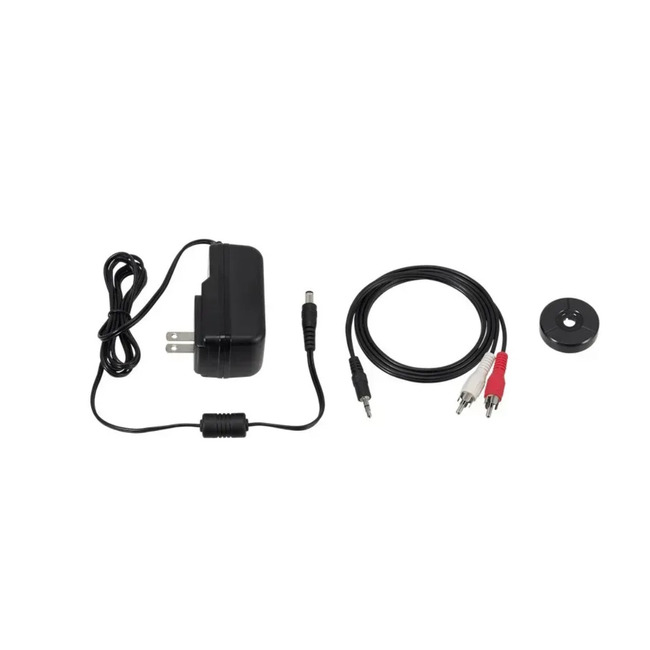 Програвач, знімний кабель RCA (штекер 3,5 мм — подвійний штекер RCA), адаптер на 45 об/хв і знімний пилозахиснна кришка на петлях.