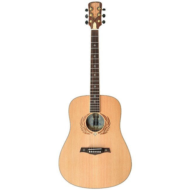 Акустична гітара Dreadnought. Мензура: 650. Верхня дека: кедр. Задня дека і обичайка: червоне дерево. Кант: клен. Накладка грифа: палісандр. Литі кілки. Регульований анкер. Інкрустація на грифі і розетці. Колір: натуральний.