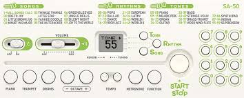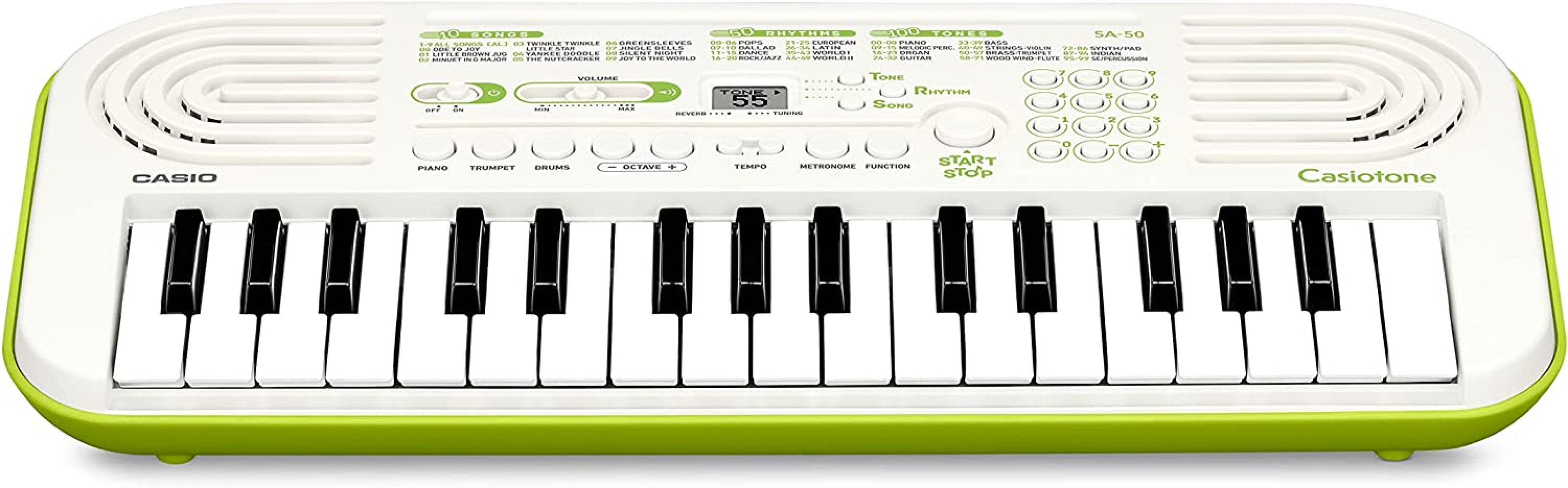 Нова модель Casio SA-50 має 32 клавіші зменшеного типу, що чудово підійдуть навіть для наймолодших музикантів. 100 високоякісних вбудованих тембрів, що охоплюють широкий спектр інструментів, включаючи фортепіано, духові, ударні та багато інших. Найпопулярніші тембри можна вибирати не лише за допомогою цифрової панелі, але й скориставшись спеціальними кнопками швидкого вибору. 50 ритмів у різних жанрах, включаючи поп, балади, танцювальну музику і т.д. Завдяки функції "Melody Off" можна відключити мелодію у вбудованих композиціях і підігравати самому, а можливість уповільнення мелодії та функція метронома допоможуть якісно засвоїти вивчений матеріал.