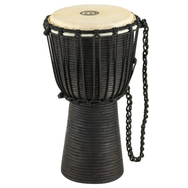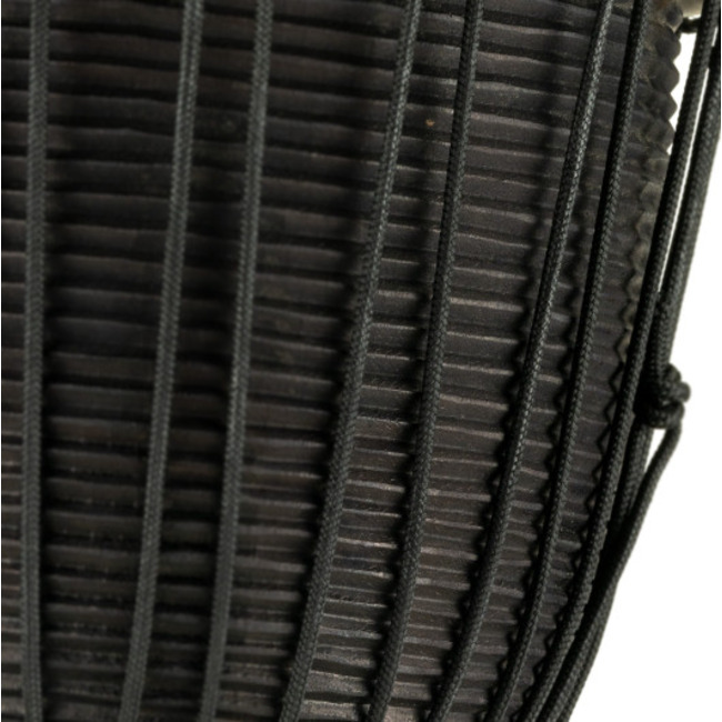MEINL Djembe Black River Series - гарний зовнішній вигляд завдяки ручному різанню по дереву, яке своїми горизонтальними лініями нагадує поточну річку. Ця текстура не тільки добре виглядає, але й робить зручним утримання джембе між колінами. Джембе доступні в чотирьох різних розмірах для гравців різного віку. Мембрана з вручну відібраної шкіри козла захищена традиційною системою переплетення Mali із стрейчових нейлонових мотузок.