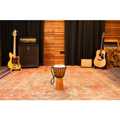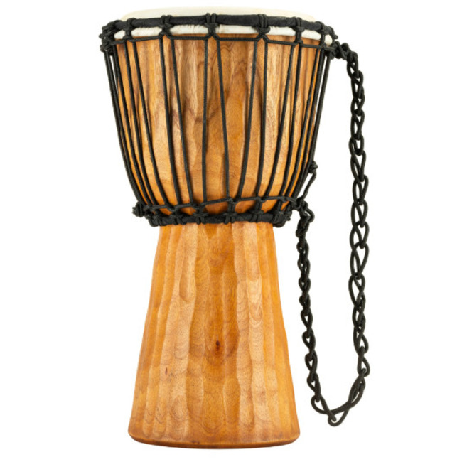 Джембе має особливу деталь — кожен інструмент оснащений мембраною з козиної шкіри, відібраною вручну. Такий вибір не лише додає візуальної виразності, а й впливає на унікальне звучання барабана. Шкіра козла, ретельно підібрана за текстурою та міцністю, створює теплий, глибокий резонанс, який ідеально поєднується з корпусом із червоного дерева. Це ще одне підтвердження відданості Meinl створенню інструментів, що захоплюють як зовнішнім виглядом, так і звучанням.