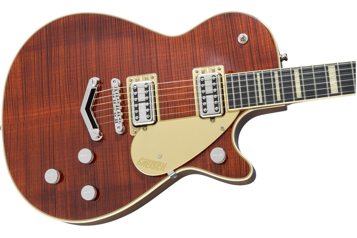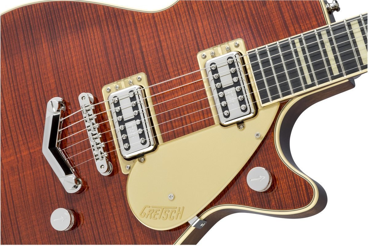 Найновіша електрогітара GRETSCH G6228FM PLAYERS EDITION JET BOURBON STAIN дає вам потужний овердрайв і мерехтливий чистий тон при натисканні перемикача.