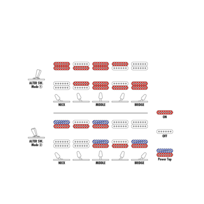 Гітара оснащена звукознімачами DiMarzio Fusion Edge, розробленими у співпраці з Ibanez. Вони дають щільний низ, пронизливі верхні частоти та виняткову читаність середніх, а режим Power Tap дозволяє отримати реалістичне звучання синглового звукознімача при грі двох хамбакерів. Система dyna-MIX10 з перемикачем Alter забезпечує десять варіантів звучання та зручне перемикання між режимами хамбакера та синглу.