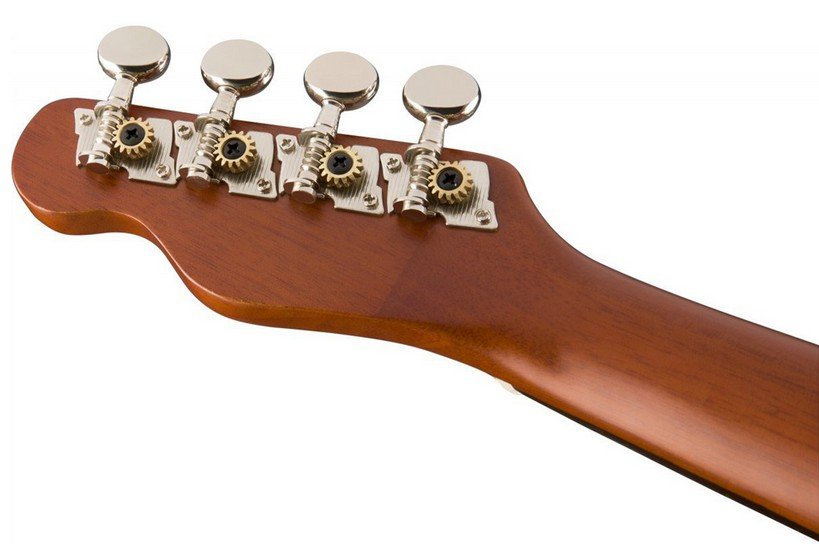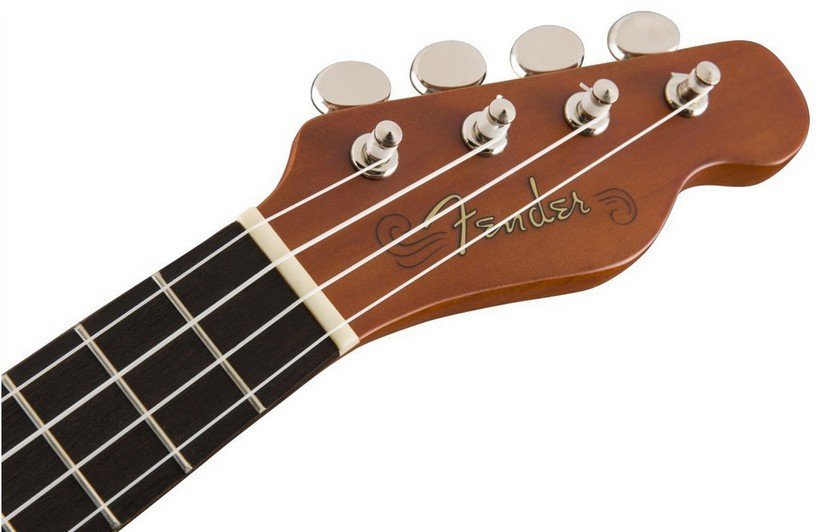 Гриф профілю Slim З виконаний з деревини нато з накладкою з горіха, він також дає додатковий комфорт при грі, а бридж No-Tie дозволяє легко і швидко змінювати струни. На грифі 12 ладів, мензура - 13.6 '' (345 мм). Укулеле має стильний зовнішній вигляд. Модель представлена в вишневому кольорі з хромованою фурнітурою. Корпус має матову обробку і кремову окантовку. Голова грифа форми Tele® 4-в-ряд дозволяє безпомилково дізнатися інструмент виробництва Fender.