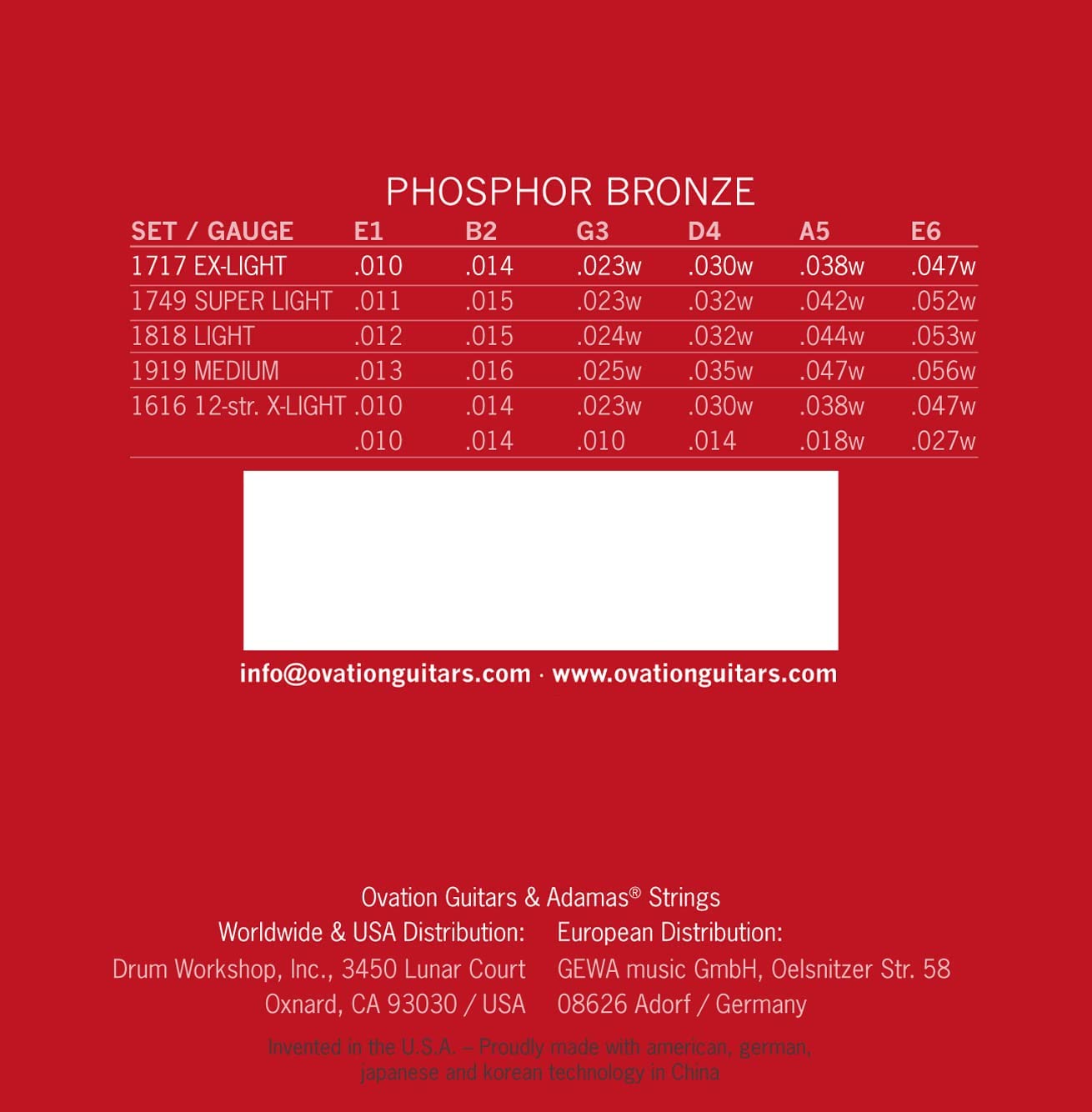 Струни Adamas Composite Gauging 1849 Light виготовляються з високоякісної сталі та мають обмотку із фосфорної бронзи зі збільшеним вмістом міді. Особливість цих струн – технологія Gauging TM: ядро струн E6 та A5 мають ідентичну товщину як і обмотка, що забезпечує збалансоване коливання струн, тим самим надає звучанню гармонійних обертонів та чистоти кожної ноти. Також така технологія забезпечує велику амплітуду коливання, що, у свою чергу, пропонує виразний, об'ємний тон. Струни A5, G3, і B2 є дещо тоншими, ніж струни для акустичних гітар інших виробників, проте зберігають збалансований натяг і пропонують максимально комфортну гру, особливо для гри бендів.