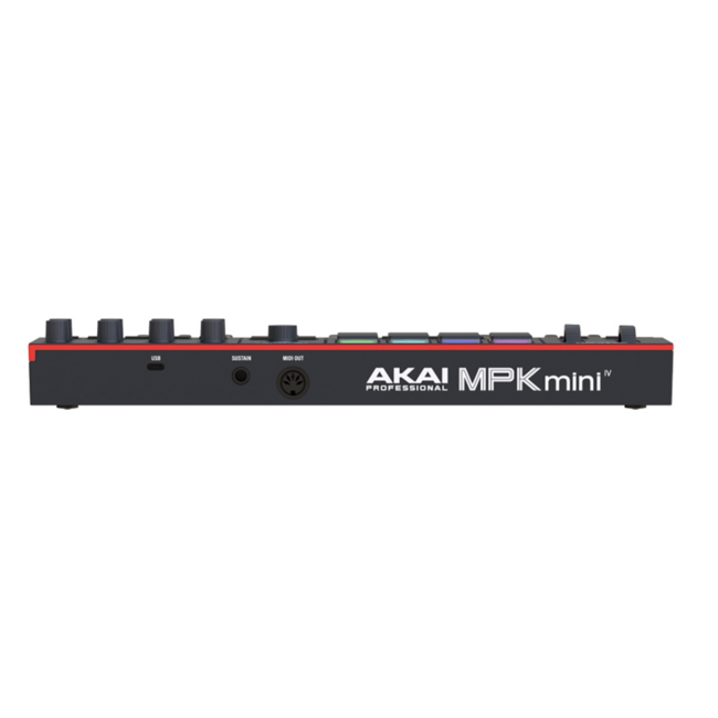 З боку підключень AKAI MPK mini MK4 універсальний: він живиться USB-C від комп'ютера, має повнорозмірний MIDI-вихід для підключення до апаратних синтезаторів і робочих станцій, а також вхід для педалі сустейна. Такий набір робить його центром як домашньої студії, так і мобільного лайв-сетапу.