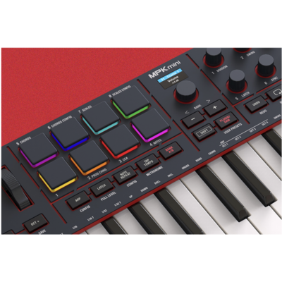 AKAI MPK mini 4 Black – 25 мініклавіш із чутливістю до швидкості, 8 RGB-падів із чутливістю до натиску, 8 призначуваних 360° енкодерів, повноколірний дисплей, оновлений арпеджіатор з функціями Pattern Freeze Mutate, 1000 пресетів, живлення через USB-C, MIDI-вихід DIN-5, колір – чорний.