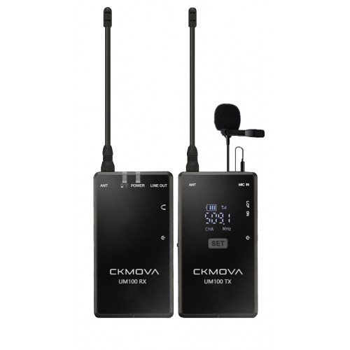 CKMOVA UM100 Kit1 – це компактна цифрова бездротова мікрофонна система, яка забезпечує високоякісний звук для користувачів практично в будь-якому сценарії. Це просте рішення для інтерв'ю та прямої трансляції в поєднанні, наприклад, із дзеркальною камерою, смартфоном або комп'ютером. UM100 Kit1 поставляється з одним накладним передавачем (UM100 TX) та одним приймачем (UM100 RX), сумісним зі смартфоном, камерою та іншими пристроями з 3,5-мм входом. Система має 20 каналів і автоматичне сполучення для швидкої та простої роботи. Передача даних здійснюється бездротовим шляхом від передавача до приймача на відстані 50 м. Діапазон частот бездротової мережі становить 470-510 МГц/550-590 МГц.