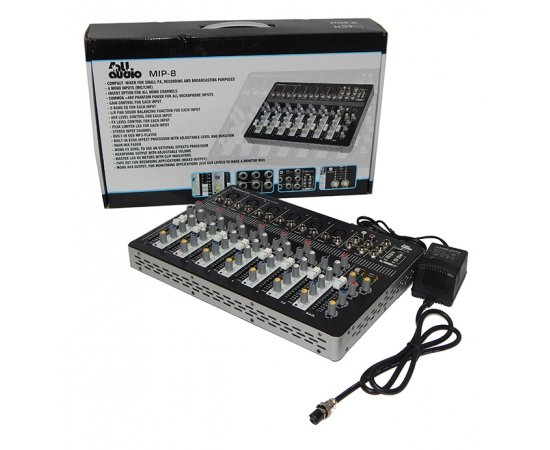 Мікшерний пульт 4all Audio MIP-8 - є універсальною моделлю з 6 моно і 1 стерео каналами. 4all Audio MIP-8 обладнаний трьохсмуговим еквалайзером на кожному каналі. Діапазон частот знаходиться в межах від 10 Гц до 45 кГц. Даний мікшер виконаний в міцному металевому корпусі, який надійно захищає внутрішні компоненти від різних пошкоджень. Інтегрований USB-програвач. Якщо музика є Вашим хобі, то цей ідеальний мікшерний пульт для Вас.