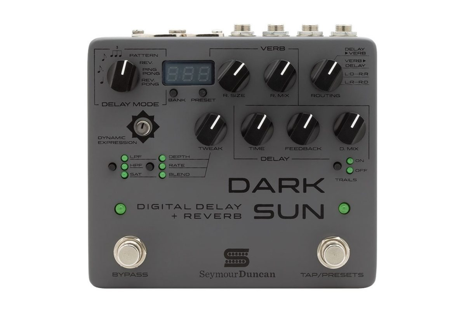 У SEYMOUR DUNCAN DARK SUN DELAY/REVERB доступно 4 шаблони: четвертні ноти, восьмі з точками, восьмі та тріолі. Ви можете встановити темп за допомогою кнопки Tap, регулятора Time або MIDI, а час може відображатися в мілісекундах або ударах у хвилину (це можна встановити, утримуючи перемикач trails при включенні живлення пристрою). Він повністю підтримує MIDI-з'єднання й оснащений портом micro-USB для оновлення прошивки та управління пресетами.