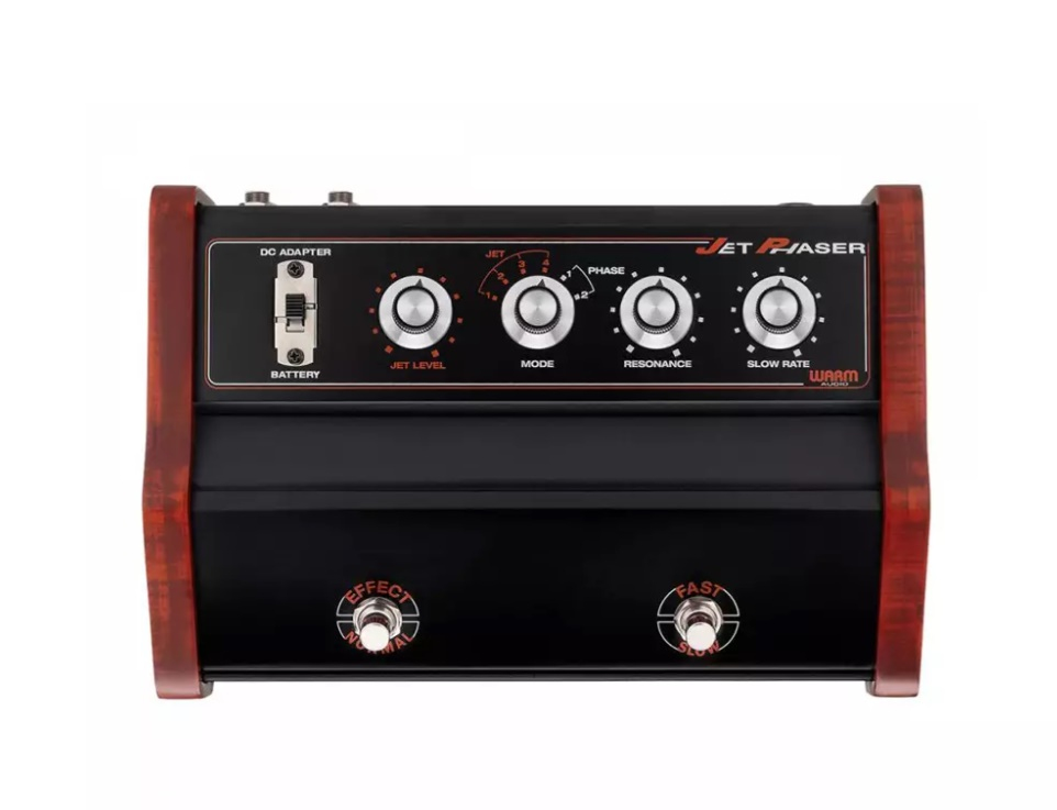 Основні особливості педалі ефектів WARM AUDIO Jet Phaser: Точне відтворення оригінальної «реактивної» фазової схеми; Скрізь використовуються компоненти преміумкласу, включаючи вуглецеві плівкові резистори та плівкові конденсатори; True bypass; Шість режимів: JET (1-4), PHASE (1-2); Педальні перемикачі EFFECT/NORMAL і FAST/SLOW; Регулятори JET LEVEL, MODE, RESONANCE і SLOW RATE; Поступова зміна швидкості при натисканні перемикача FAST/SLOW, що імітує кабінет з поворотним динаміком; 1/4" вхід і вихід; Перемикач DC ADAPTER/BATTERY; Міцний сталевий корпус з красивими дерев'яними боковими панелями; Живлення від батарейки 9 В або від адаптера постійного струму 18 В (у комплекті).