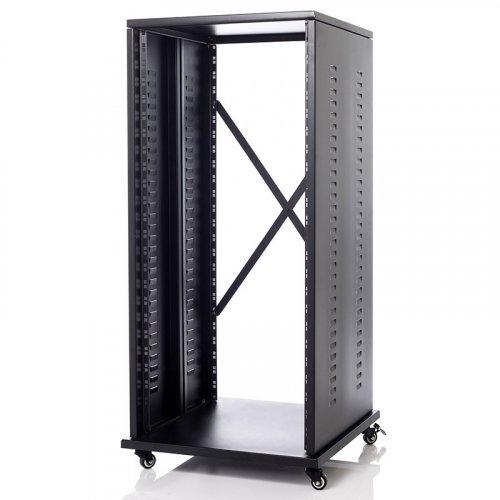 BESPECO STRK24 - металева річок-стійка для студії на коліщатах. Висота 24U, ширина 19 ". Колір: чорний, фарба НЕ містіть цієї токсичної Речовини. Має Х-подібний стабілізатор стійкості.