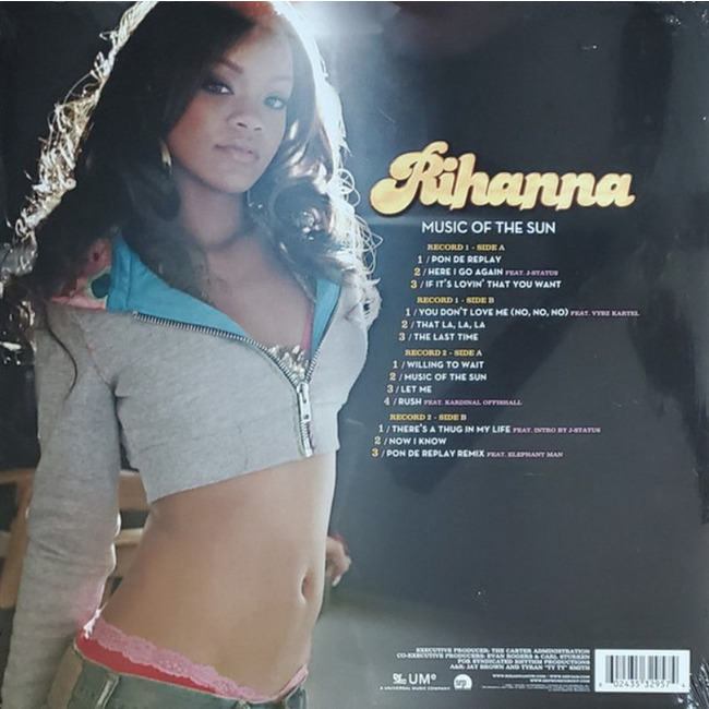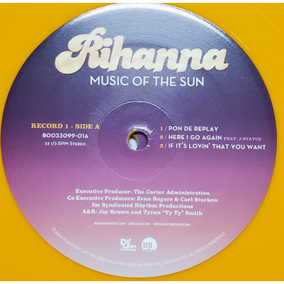 Rihanna – Music Of The Sun (2023, Def Jam Recordings / SRP Records / Universal Music Group) — перевидання дебютного альбому на двох кольорових платівках. Видання виконано на жовтому вінілі з непрозорим ефектом (opaque yellow) у стандартному конверті з відтворенням оригінального оформлення. Альбом включає ключові композиції раннього етапу кар’єри виконавиці, зокрема “Pon de Replay”, “Here I Go Again” та “If It’s Lovin’ That You Want”.