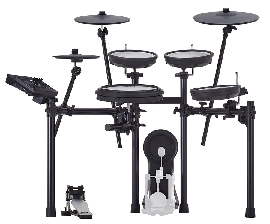 Комплект TD-17KV2 поставляється з покращеними педамі малого барабана та тарілкою для ще більшої автентичної відчуттів від гри на барабанах. 12-дюймові педі малого барабана PDX-12 і 10-дюймові педі томів PDX-8 оснащені ситчастими пластиками з регульованим натягом для акустичного відгуку і відскоку, що настроюється. Крім того, PDX-12 має традиційну висоту обруча для виконання відкритих римшотів із природним кутом ключки. Обидва комплекти також включають нещодавно розроблені тонкі V-подібні тарілки, які кріпляться до стійкості за допомогою спеціального шарнірного кріплення, забезпечуючи акустичне розгойдування та реакцію палички під час гри.