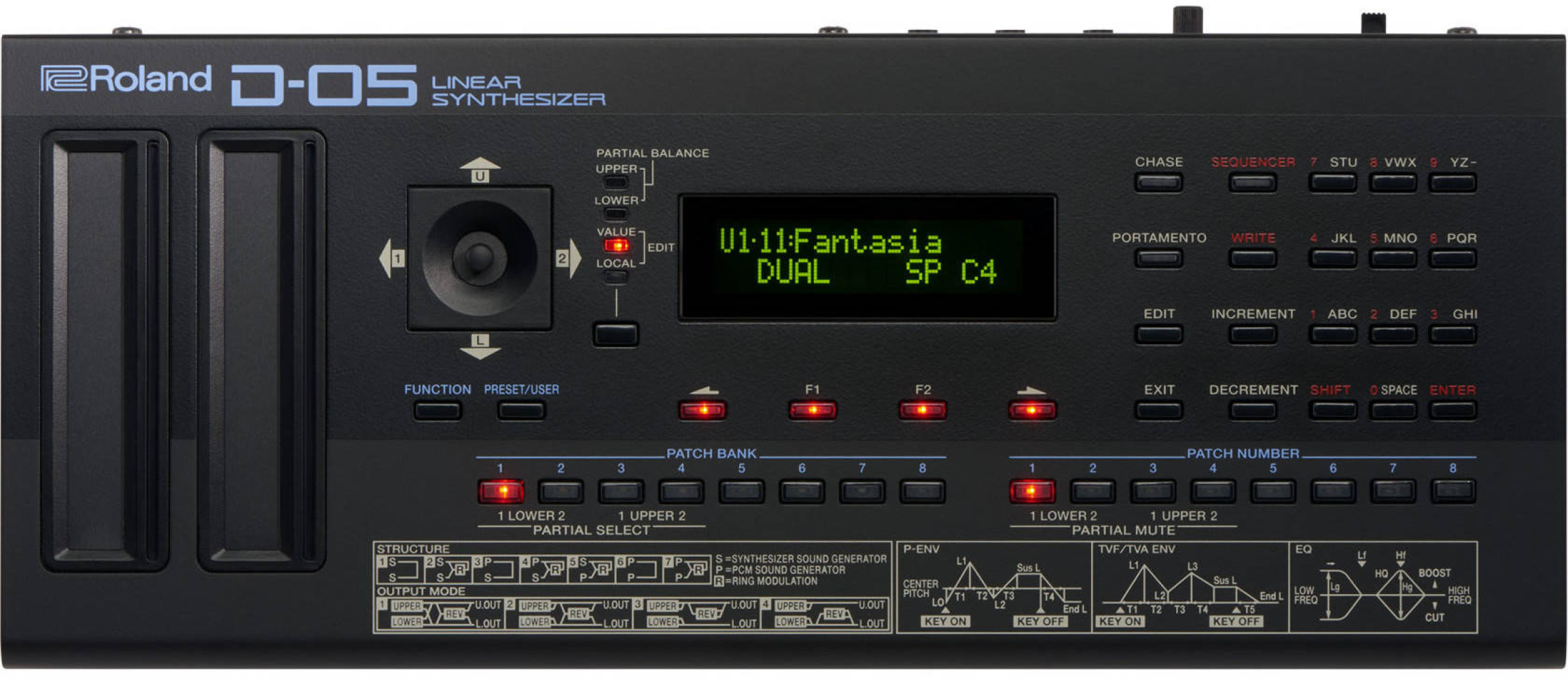 Roland D05 - синтезатор оснащується 64-кроковим поліфонічним секвенсором, вбудованим арпеджиатором, має 16-нотну поліфонію. Звуковий модуль серії Boutique, на основі раритетної моделі D50 (петча сумісні), технологія моделювання DCB (Digital Circuit Behavior), поліфонія 16 голосів, 64-кроковий секвенсор, два стрічкових контролера, MIDI-вхід і вихід, порт USB для комп'ютера, вбудований динамік .