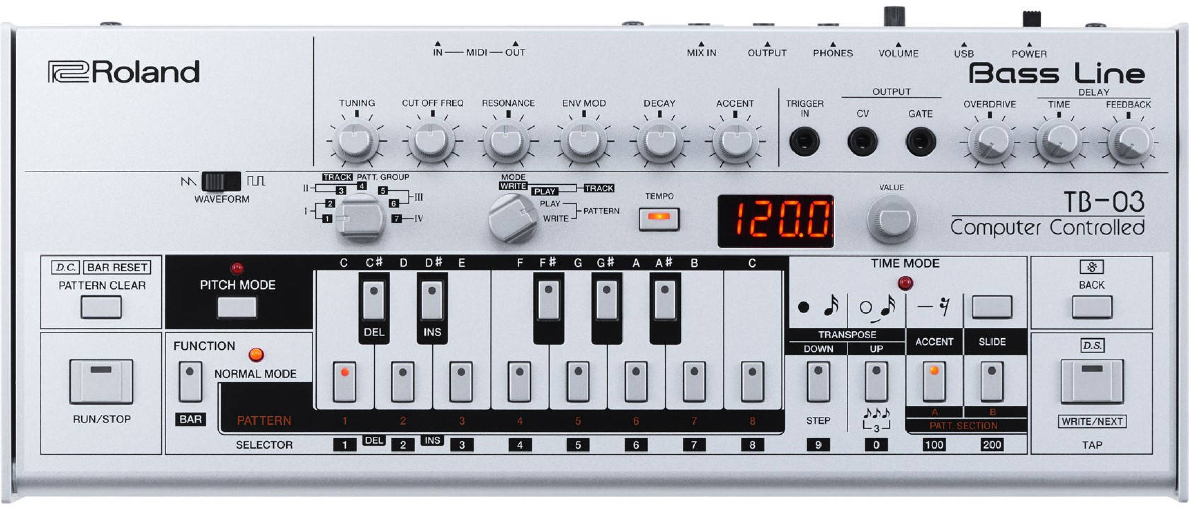 Інструмент TB-03 з живленням від батарейок є прямим нащадком знаменитого синтезатора TB-303 Bass Line. Зовнішній призначений для користувача інтерфейс змін не зазнав і виглядає, як оригінальний. Звук, завдяки технології ACB компанії Roland, яка допомогла відтворити гіпнотичні переливаються груви цього чарівного інструменту, також залишився незмінним. Однак функціональність нової моделі TB-03 була розширена. Світлодіодний 4-символьний дисплей полегшує і спрощує програмування, а ефекти овердрайва і затримки дозволяють створювати нищівну все на своєму шляху стіну звуку, ввергає слухачів в глибокий шок. При роботі в студії буде корисною можливість передачі керуючих даних по MIDI або через порт USB, також TB-03 може працювати як допоміжний аудіоінтерфейсу з дозволом 24 біт / 96 кГц.