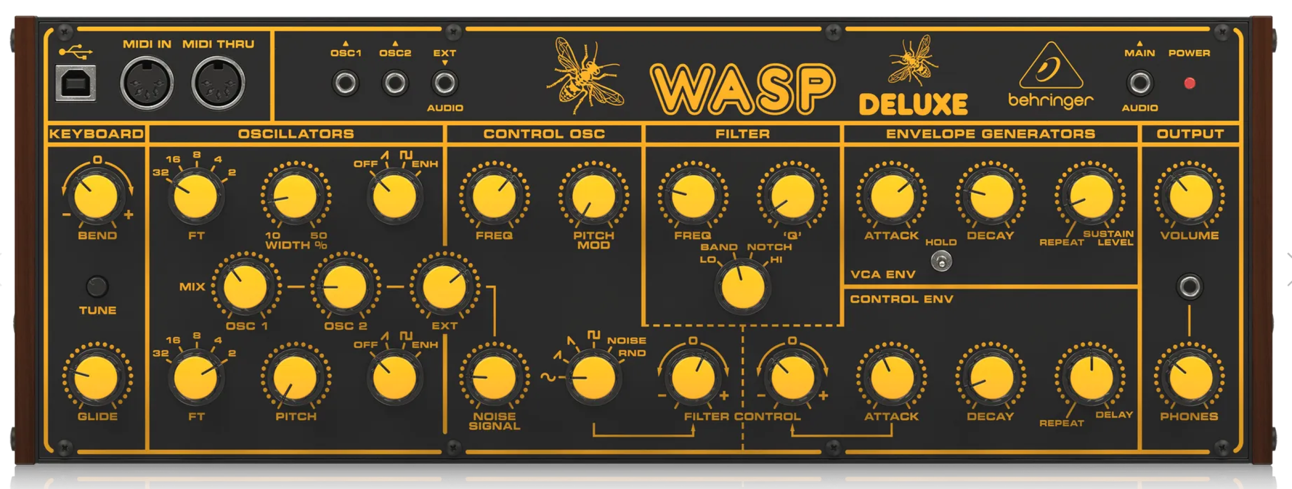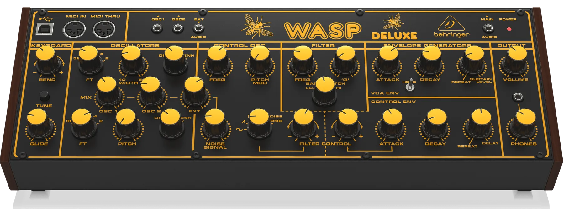 Behringer WASP Deluxe - гібридний монофонический синтезатор, копія класичної моделі EDP Wasp. Оригінальний інструмент відомий завдяки своєму різкого і гострого звучання. EDP Wasp був заснований на здвоєному цифровому осцилляторе зі здвоєними огинають і оснащувався аналоговим мультірежімним фільтром і секцією модуляції. Копія в точності повторює всі схеми оригінального інструменту. Модель оснащується точними копіями оригінальних транзисторів і JFET.