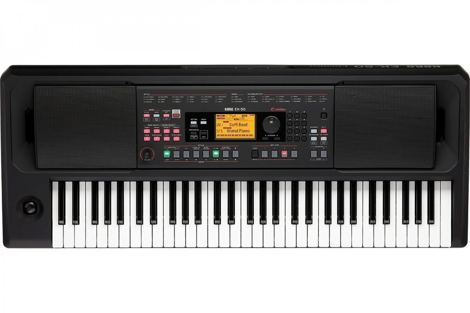 На додачу до багатства звуків від KORG EK-50, які підтримують широкий спектр музичних жанрів, розробники повною мірою скористалися перевагами великих динаміків, додавши звуки і стилі для найновішої танцювальної музики. Тепер корпус має чорне гумове покриття, яке не тільки гладке, а й надійне та зносостійке.