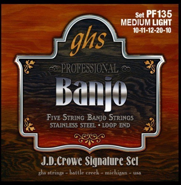 Струни для банджо GHS PF135. Комплект струн для 5-ти струнного банджо. Перші струни: сталь. Басові струни: нержавіюча сталь. Натяг: Medium Light. Струни забезпечені петлею на кінці, що забезпечує універсальне кріплення