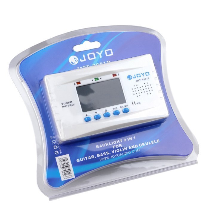 JOYO JMT-9001B - хроматичний тюнер з метрономом та тон генератором для уніерсального застосування. Пристрій обладнаний кольоровим дисплеєм, тому у темних приміщеннях (або ж на сцені з потужним освітленням) можна швидко й комфортно налаштувати інструмент. Кожна з функцій: метроном, тюнер та камертон мають свою індивідуальну кольорову палітру, для швидкого розуміння у якому режимі працює на даний момент. JMT-9001B має й гучний вбудований динамік, а також можна під'єднати навушники, що стане чудовою опцією особливо для барабанщиків. Компактний розмір, усі необхідні функції і приємна ціна дозволили цій моделі стати справжнім бестселлером на ринку аксесуарів для гітари й швидко завоювати прихильність багатьох музикантів.