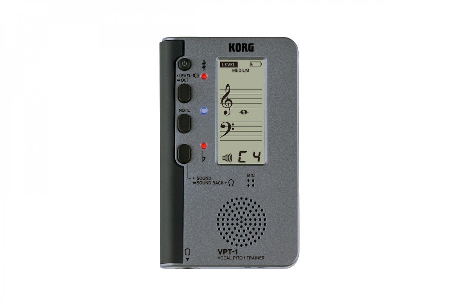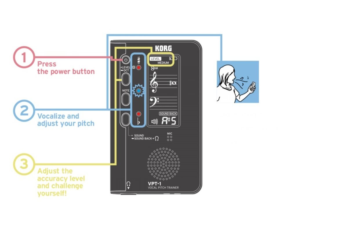 KORG VPT-1 розташовується вертикально і його зручно тримати в лівій руці. На корпусі розміщений вбудований мікрофон, дисплей і три світлодіоди (два червоних і один синій). Коли ви співаєте в мікрофон, нота відображається на дисплеї, на одному з двох нотних станів, зі скрипковим і басовим ключем (які дають уявлення про точну висоту звуку). Червоні світлодіоди показують, вище або нижче тон, відносного того, який вам потрібен. Як тільки ви заспіваєте "правильно", загориться синій світлодіод по центру. Індивідуальні особливості також враховуються за допомогою функції зсуву октави, при цьому зберігається відображення нот в межах п'яти ліній.