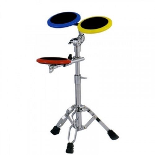 Тренувальна ударна установка з трьох пластикових педів чорного кольору і однієї сталевої стійки.На пед наклеєний матеріал з гуми, який дає більш менш схожий на справжній, відскік барабанної палички.