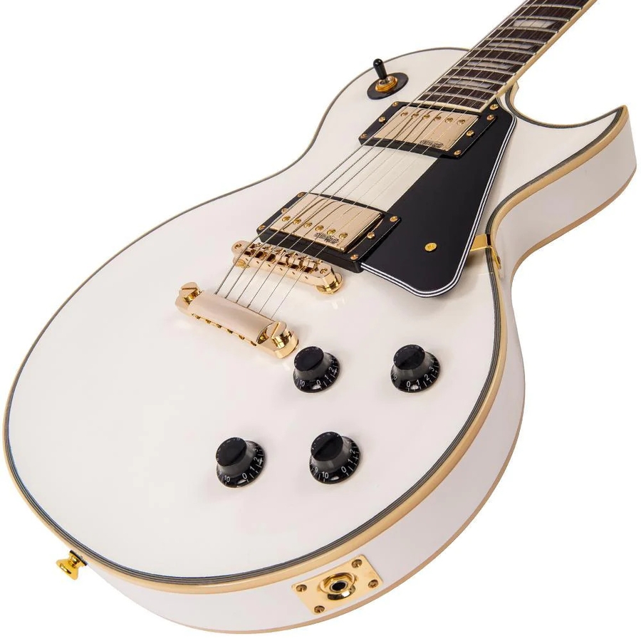 Корпус з червоного дерева з облицюванням Flame Maple Veneer забезпечує резонанс, тон і комфорт «правильного ваги». Vintage LV100CS відрізняється унікальною еволюційною формою корпусу з витонченим низхідним бічним плечем басів і геніально сконструйованої зміщеною п'ятою, що забезпечує покращений доступ до верхньої частини грифа.