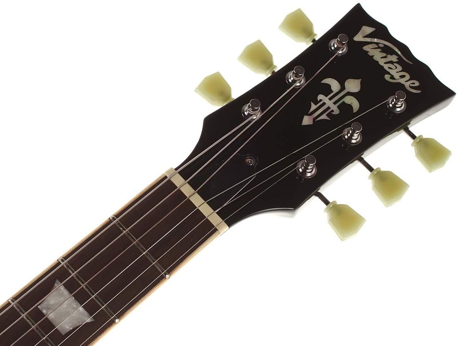 Корпус з червоного дерева з облицюванням Flame Maple Veneer забезпечує резонанс, тон і комфорт «правильного ваги». Vintage LV100CS відрізняється унікальною еволюційною формою корпусу з витонченим низхідним бічним плечем басів і геніально сконструйованої зміщеною п'ятою, що забезпечує покращений доступ до верхньої частини грифа.