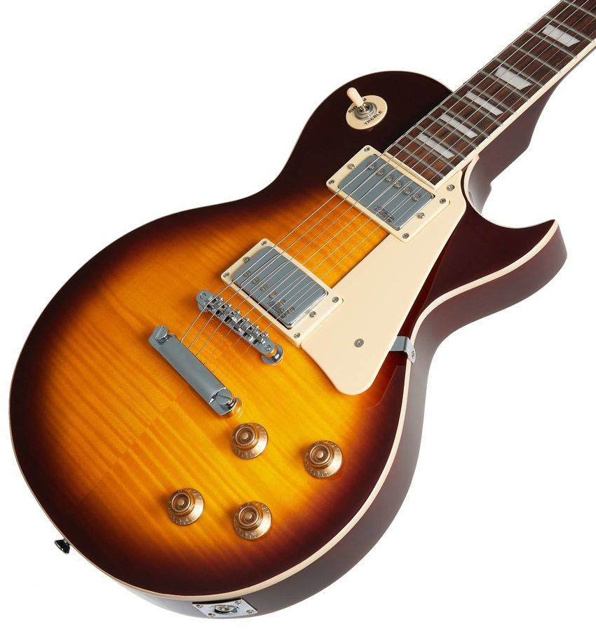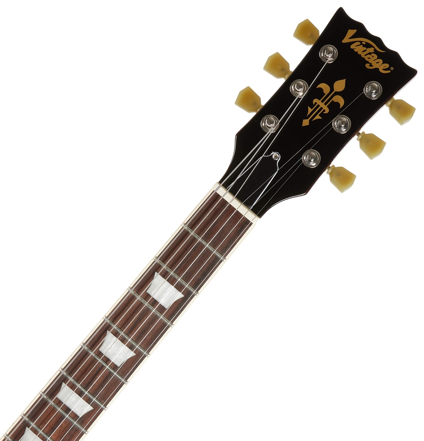 Корпус з червоного дерева з облицюванням Flame Maple Veneer забезпечує резонанс, тон і комфорт «правильного ваги». Vintage LV100CS відрізняється унікальною еволюційною формою корпусу з витонченим низхідним бічним плечем басів і геніально сконструйованої зміщеною п'ятою, що забезпечує покращений доступ до верхньої частини грифа.