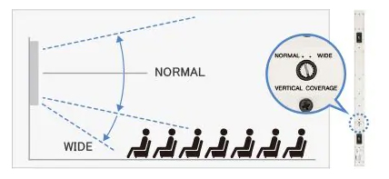 Вертикальне покриття (охоплення) можна налаштовувати, використовуючи перемикач, розміщений на задній панелі. Положення "Wide" збільшує кут дисперсії виключно в нижньому напрямку, покращуючи охоплення в передній частині зони прослуховування (наприклад, перші ряди аудиторії) в ситуації, коли акустичні системи встановлені високо.