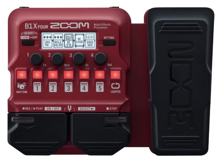 ZOOM B1X FOUR - процесор, 44.1 kHz / 32 bit, 70+ ефектів, до 5 ефектів одночасно, 50 осередків пам'яті, вбудована педаль, лупер до 30 сек, драм машина, тюнер, USB, AUX In, робота від 4 батарейок АА до 18 годин, харчування від блоку живлення, батарейок або USB.