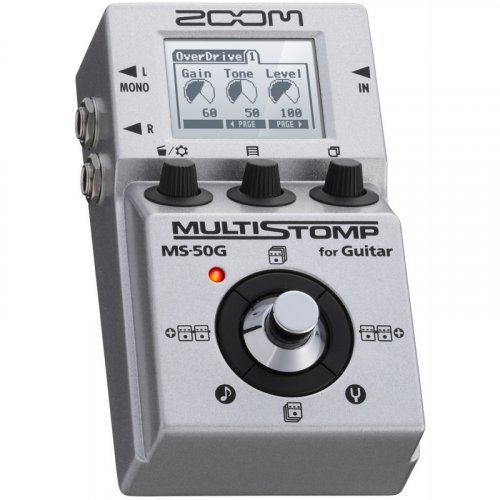 ZOOM MS-50G - компактна мульти педаль ефектів для електрогітари. Педаль ефектів ZOOM MS-50G поєднує в своєму компактному корпусі міць педалі мульти-ефектів і гнучкість емулятора кабінету. 55 класичних ефектів і модуляцій підсилювачів, простий і зрозумілий інтерфейс, авто-хроматичний тюнер і універсальні можливості харчування